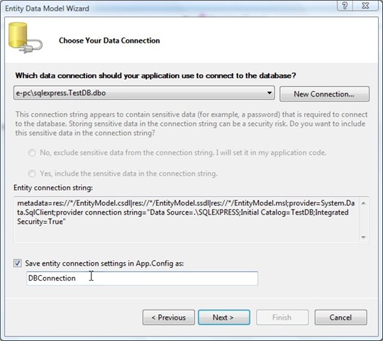 Create the connection. Note that the wizard automatically creates a key in the web.config or app.config with the connection string inside it (nice feature)