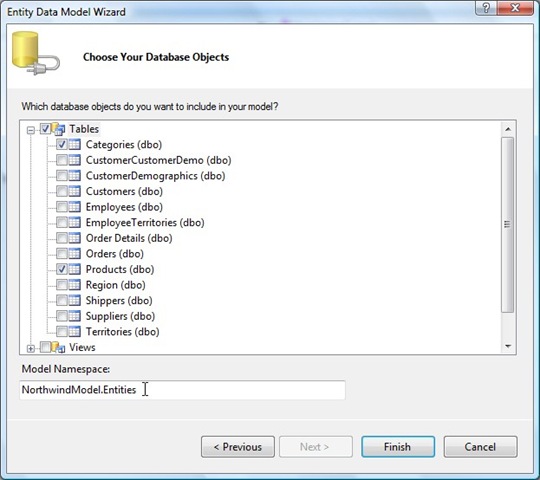 In Our case we will simply Select the “products” and “Categories” Tables from the List of tables available in the Northwind database. (This is just for simplicity).
