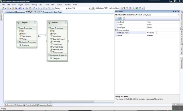 To make the Model more easy to understand and more natural, you can set the name for the Entity (Product as opposed to products like the table name in the database) and the Name of the Entity Set (we can make it Products or ProductSet or whatever)